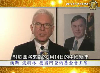 【新唐人2010年2月13日訊】德國阿登納基金會主席Hans-Gert Pöttering賀年做為歐洲議會的前任主席和德國阿登納基金會的主席,對於即將來臨的2月14日的中國新年,我向全世界所有華人致以衷心祝願。最後,我向神韻藝術團致以衷心祝願,他們把美好古老的中國文化帶給了全世界人民。