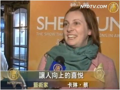 神韻觀眾卡倫•鄧肯比:“色彩和舞蹈動作簡直......我都要哭了,太美了!還有展現的普世精神,非常美,我慶幸能來看演出。”