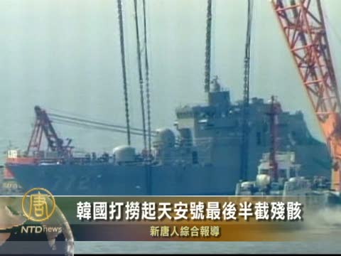 【新唐人2010年4月24日訊】星期六(4月24日)韓國吊起了天安號的艦首,並找到一具屍體。天安號在3月26日在與朝鮮接壤的海域爆炸後沉沒,造成46人死亡。