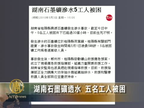 【新唐人2010年5月3日訊】湖南省桂陽縣一座石墨礦,週日凌晨開始透水,5名在井下工作的礦工被困。截止週一中午,在被困30多小時後,仍未有5人消息,生死不明。