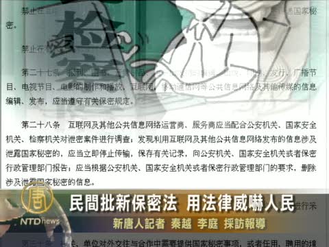 【新唐人2010年5月4日訊】中共全國人大近日重新修訂的《中華人民共和國保守國家秘密法》,其中第28條條款,要求互聯網及資訊公司的運營商要給予合作。對此,民間普遍認為,是法制的倒退。