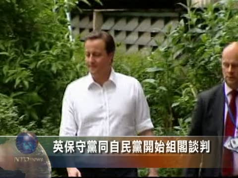 【新唐人2010年5月8日訊】週五,英國保守黨和自民黨就聯合組閣進行談判。之後,保守黨表示,這只是雙方“初步的討論”。預計談判週六會繼續進行。保守黨黨魁卡梅倫稍早表示,保守黨和自民黨在許多問題上有相同的政策目標。