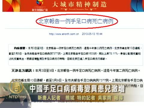 【新唐人2010年5月15日訊】5月份氣溫升高,中國手足口病患兒人數倍增,山東和北京近期都報告死亡病例,菏澤市發病數量高居山東省17市之首,該市疾控中心和醫護人員都表示,今年病毒變異導致手足口病疫情蔓延快,重症患兒多。