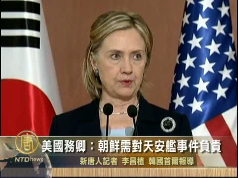 【新唐人2010年5月27日訊】5月26日,正在韓國訪問的美國國務卿希拉里.克林頓警告朝鮮必須停止軍事挑釁。她重申美國將全力支持韓國,並呼籲國際社會應該對朝鮮的行為,做出具體回應。目前,加拿大已經率先表態,宣佈與朝鮮斷交。