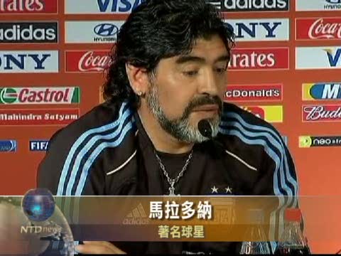 【新唐人2010年6月12日訊】11日,在世界盃開幕日,阿根廷隊教練,曾經的著名球星馬拉多納召開新聞發佈會表示,阿根廷已經準備好與尼日利亞的首場比賽,同時呼籲各國在世界盃比賽中公平競爭。