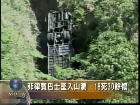 【新唐人2010年6月14日訊】菲律賓警方說,星期天一輛旅遊大巴士在菲律賓中部的宿務島墜入山澗,至少18人死亡,多數是伊朗的醫學院學生和醫生,還有至少30人受傷。官員們說,當時這些乘客正前往一個海濱休假地,似乎這輛巴士出現剎車失靈。目前救援人員在巴士殘骸中繼續找尋死難者。在菲律賓,許多致命交通事故都被歸咎於道路和車輛維修狀況差。