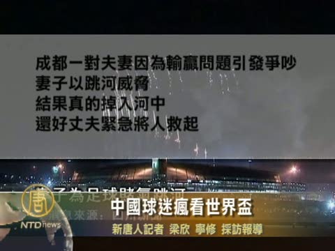 【新唐人2010年6月16日訊】2010年世界盃足球賽開打,本來觀賞球賽事件愉快的事,在中國卻發生球迷夫妻因為爭論球賽跳河﹔一位山東球迷則是熬夜看球賽,心臟病發死亡﹔醫生提出警告,有心臟、腦血管疾病的人,要注意穩定情緒而且不可過勞。