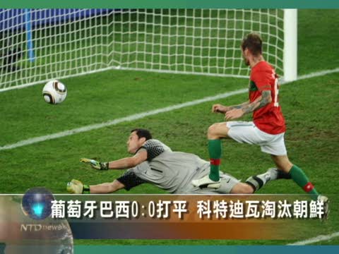 【新唐人2010年6月26日訊】南非當地時間6月25日下午4點,世界盃小組賽G組第3輪的兩場比賽在-馬布海達球場-和-姆博貝拉球場-同時進行。葡萄牙和巴西0比0打平。科特迪瓦3比0戰勝朝鮮,但仍無法改變出局的命運。朝鮮隊最後一場比賽也以失敗告終,3戰全負告別世界盃。