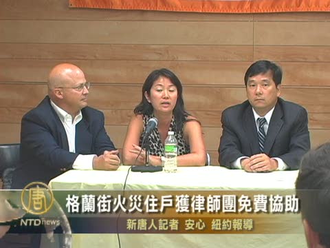 【新唐人2010年7月14日訊】今年4月11日在紐約華埠格蘭街發生的火災,造成街上的283號和285號樓被毀,旁邊的289號樓的住戶至今也無法取出財物。星期二(7月13日),一直幫助災戶的亞洲人平等會召開記者會,宣佈曼哈頓的一家律師行將免費為災戶服務,爭取應有的賠償。請看報導。