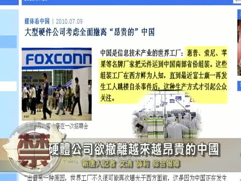 【新唐人2010年7月14日訊】多年來,中共政府人為壓低貨幣匯率,工資提升緩慢,經過前一波的工潮與加薪事件,一些大型硬體公司現在要找到新員工比過去困難多了。面臨中國未來人口老齡化,勞動力不足等嚴重問題,這些「原始設備製造廠商」正考慮全面撤離「昂貴的」中國。