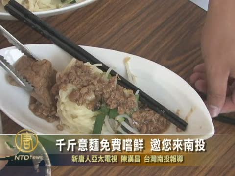 【新唐人2010年7月17日訊】意麵是南投最具特色的地方小吃之一,滑順的薄麵條淋上香噴噴的肉燥湯汁,讓饕客們的食指大動,南投市連續四年舉辦意麵節活動,在這個星期日,還會推出一千斤的意麵,大概可分裝3600碗,請民眾免費嚐鮮。