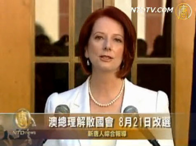 【新唐人2010年7月17日訊】澳大利亞總理吉拉德(Julia Gillard)在星期六(7月17日)正式宣佈解散國會,並將於8月21日舉行國會大選,屆時除了重新選出所有的眾議院議員之外,並有半數席次的參議院議員也將同步進行改選。