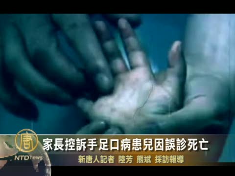 【新唐人2010年7月21日訊】中國各地手足口病來勢洶洶,近日有死亡病例家長反映,他們的孩子是因為醫生誤診,耽誤了病情而死亡,但是醫院和相關政府部門都不願負責,媒體也封鎖消息,意圖掩蓋疫情。
