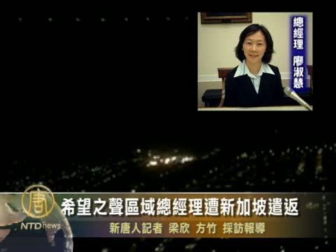 希望之聲國際廣播電臺東亞地區負責人廖淑慧,因為在印尼的合作夥伴新紀元電臺的業務,11號晚上前往新加坡時,入境受阻,稍早前被野蠻押上飛機遣返台灣,對此一舉動,新加坡政府至今沒有提出任何解釋。希望之聲國際廣播電臺總裁曾勇表示,已經將此事通告美國和歐洲的相關單位。
