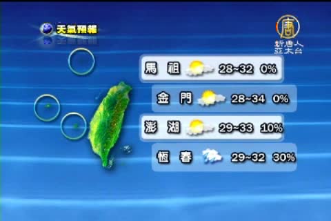 【新唐人亞太台2010年8月15日訊】來關心天氣,中央氣象局表示,明天由於高壓稍微減弱,東部迎風面會有短暫陣雨,提醒民眾注意。以下帶您關心8月15號星期天,全台各地以及世界各主要城市的天氣預報。