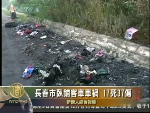 【新唐人2010年9月4日訊】星期五(9月3號)下午,一輛長途雙層臥鋪客車,在吉林省長春市環城高速行駛時,發生爆胎,之後衝過隔離帶,連撞對向兩輛車後起火,造成17人死亡,37人受傷。
