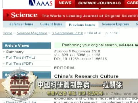【新唐人2010年9月13日訊】拉關係,成了中國科研體制的弊病。最近,來自北大和清華的兩名海歸學者在美國《科學》雜誌上發表文章,披露中國科研基金分配不公,是基於關係而非學術成就。有學者指出,在中共體制和畸形意識形態下,中國科學界正在演變成生意場,科研成爲很多人追逐名利的工具,而不是探索自然界規律或解決國計民生的途徑。