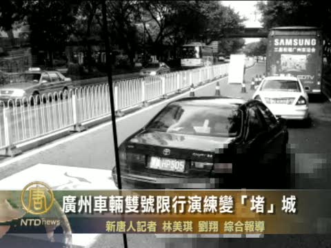【新唐人2010年9月15日訊】廣州市因為亞運,開始爲期四天的車輛單雙號限行演練,13號的演練首次在上班日進