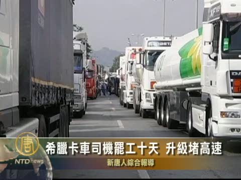 【新唐人2010年9月21日訊】希臘卡車司機的罷工在這個星期一(9月20日)進入第十天, 罷工進一步升級, 司機們把卡車停在了高速公路上堵塞了交通,他們要求政府取消為獲取國際貨幣基金組織的救援,所採取的改革措施。