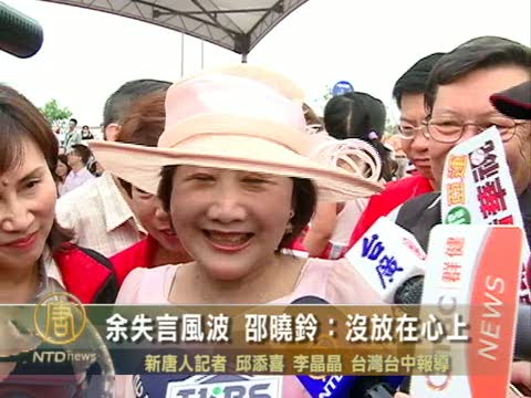 【新唐人2010年9月29日訊】民進黨立委余天幫臺中市議員輔選,抨擊胡志強夫妻健康問題,失言風波引發爭議,事隔三天,臺中市長夫人邵曉鈴29號上午首度亮相,與市長胡志強一同出席臺中大坑廍(ㄅㄨˋ)子區,新橋通車典禮,面對媒體的詢問,邵曉鈴正面回應說,沒把余天的話,放在心上。