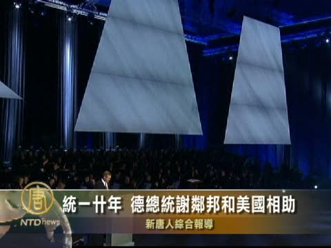 【新唐人2010年10月4日訊】10月3日是德國統一的二十週年紀念日,在布萊梅舉行的慶祝儀式上,德國總統克里斯蒂安-伍爾夫(Christian Wulff)感謝了20年前在兩德統一前夜,俄羅斯、波蘭、匈牙利和美國所作出的幫助,而這些幫助推動了德國統一歷史進程的發生。