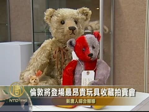 【新唐人2010年10月9日訊】10月9號(星期六),包括罕見的泰迪熊等1300多件私人收藏的玩具將在倫敦拍賣。這次拍品的總估價,超過160萬美元,被認為是世上最昂貴的玩具拍賣會。
