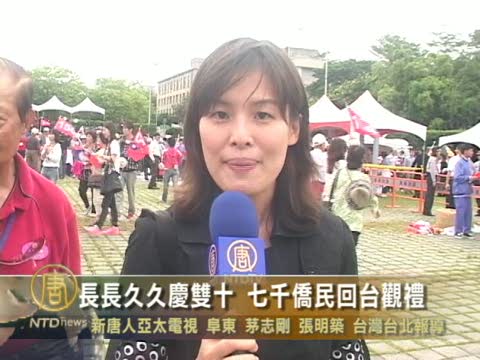 記者:「今天是中華民國99年雙十國慶,去年因為莫拉克風災重創南台灣,所以去年國慶活動宣佈停辦一年,今年不但擴大辦理,同時也為明年的建國百年先揭開序幕。今年一共有260多位外賓來台灣參加國慶慶祝大典觀禮。也有近七千名僑胞自海外返臺參加今年的國慶慶祝大會,我們為您訪問到來自美國洛杉磯的熊伯伯,請他談談今年回臺參加國慶典禮的心情。」