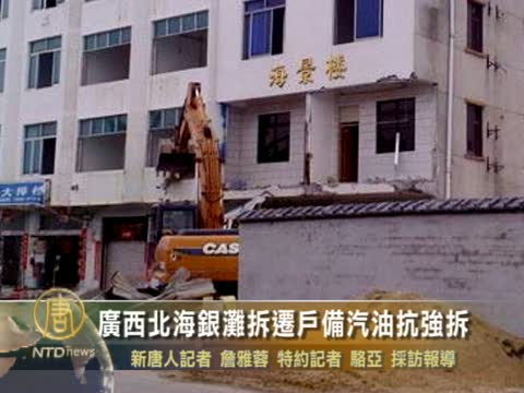 【新唐人2010年10月12日訊】廣西北海銀灘附近的白虎頭村,8號遭遇數千強拆大隊人馬圍困,當天有4棟漂亮的樓房被拆,目前還有3戶人家堅守著自己的家園,他們準備著汽油、鞭炮,將自己反鎖在家中,誓死保衛家園。