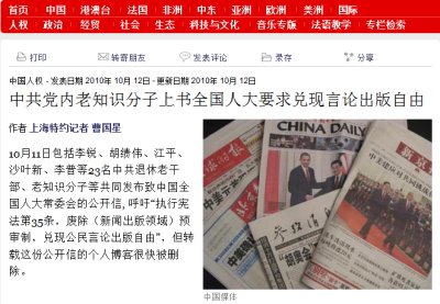 【新唐人2010年10月14日訊】【今日點擊】(875) 黨内老幹部上書要求兌現言論出版自由