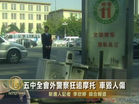 【新唐人2010年10月18日訊】中共五中全會第二天,便衣警察懷疑京西賓館會場外一輛三輪摩託車是訪民駕駛,而狂追攔截,造成三輪摩託車毀人重傷。