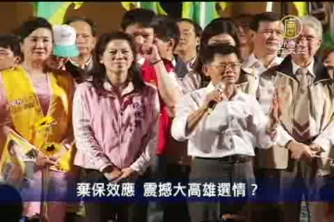 【新唐人亞太台2010年10月18日訊】鏡頭轉回台灣。關心五都選情。親民黨主席為無黨籍大高雄市長參選人楊秋興站台,公開力挺的動作,被解讀為,為大高雄選情投下震撼彈,楊秋興認為,這對競選團隊氣勢有正面影響。不過是不是代表泛藍選票倒戈,棄保效應發酵?國民黨候選人黃昭順認為,親民黨是要「棄楊保黃」,而民進黨陳菊則是說,這是藍營內部鬥爭,跟她沒有關係。