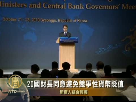 【新唐人2010年10月24日訊】星期六,20國財長會議在韓國慶州市落下帷幕。與會的財政主管達成共識,避免競爭性的貨幣貶值,但是卻無法就明確的條款達成一致。