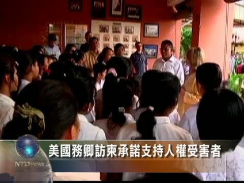 今年是柬埔寨和美國建交60週年。希拉里在暹粒(Siem Reap)訪問了美國資助的打繫人口走私的“婦女與少女救助組織”(AFESIP),其間她承諾美國對違犯人權事件受害者的支持。