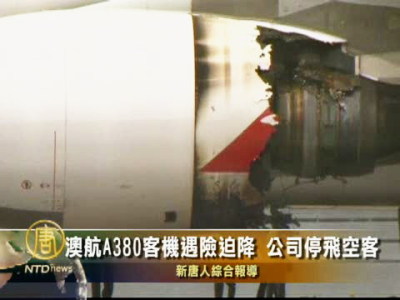 【新唐人2010年11月4日訊】澳洲航空公司一架空中客車A380飛機星期四因引擎發生故障,在飛往悉尼的途中,被迫折返,在新加坡緊急降落,所幸機上400多位乘客和機組人員無人受傷。事故發生後,澳航宣佈停飛旗下所有空中客機,等待檢查。