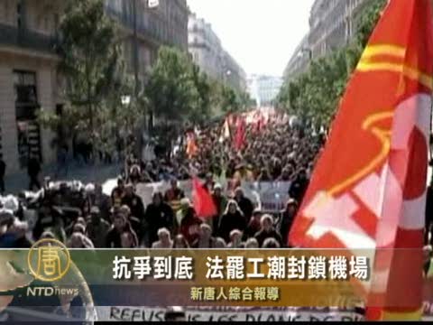 【新唐人2010年11月5日訊】在法國總統接待到訪的中共主席胡锦涛的同時,法國工會發起的反對退休制度改革的罷工浪潮也在持續擴大。巴黎的戴高樂機場和西部的南特大西洋機場都出現了機場員工封鎖機場的情況。工會更計劃在11月6日舉行”家庭遊行”,號召全國民眾走上街頭。