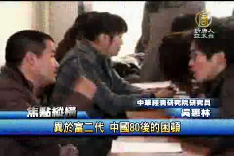 【新唐人亞太台2010年11月6日訊】藝人大S與汪小菲的閃電戀情,震驚兩岸,也讓外界窺見大陸所謂的「富二代」,對照這群多金、不愁吃穿的富二代,其實中國八0後,還有一群生活狀態完全不同的人,他們可能被稱為「蟻族」、「橡皮人」、或者是「垮掉的一代」,我們今天的焦點縱橫,為您探討這群八0後出生的年輕人的社會狀況。