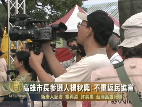 【新唐人2010年11月7日訊】大高雄選情激烈,棄保話題繼續升溫,國民黨秘書長金溥聰5號指出,民進黨高雄市長參選人陳菊如果當選,還是會將無黨籍高雄市長參選人楊秋興找回去。楊秋興今天(6號)表示,不會重回民進黨或加入其他政黨。