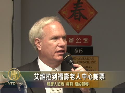 【新唐人2010年11月9日訊】前市議員託尼.艾維拉在中期選舉中擊敗已在位38年的共和黨州參議員帕多文(Frank Padavan),贏得紐約州第11選區參議員一職。11月8日,他到法拉盛福壽老人中心,感謝華人對他的支持。請看報導。