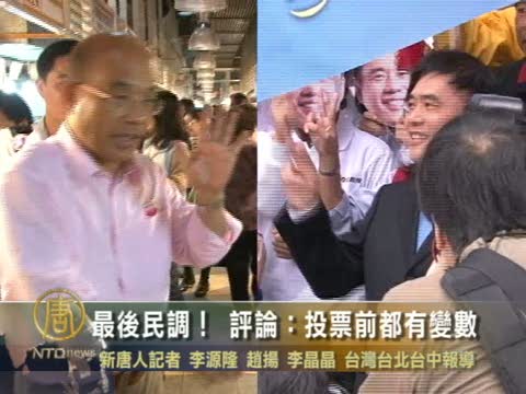 【新唐人2010年11月16日訊】台灣的五都選戰已經進入倒數第十一天,因為選罷法規定,選前十天不准公布民調,所以各黨機構,也抓緊最後一天公布民調機會,不過,對於各家都有自己的調查方式,結果也不盡相同,那麼,關於公布民調,是否會間接影響到選民的投票率,民眾的看法又是如何?繼續是我們的報導。