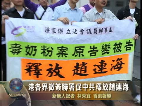 【新唐人2010年11月18日訊】“結石寶寶之家”創辦人趙連海遭北京法院重判入獄兩年半,目前正在獄中絕食,香港公民黨星期三遊行到中共駐港辦事處遞交市民簽名,要求當局立即釋放趙連海。