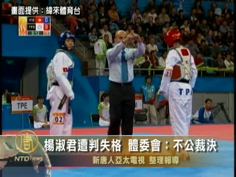 【新唐人2010年11月18日訊】台灣跆拳好手楊淑君,星期三上午在廣州亞運女子49公斤級,對決越南選手的時候,因為電子襪不符規格,在第一回合9:0大幅領先的情況下,被突然裁量取消比賽資格,以0:12落敗,對於這個不公裁決,體委會立即發表聲明,表示遺憾。