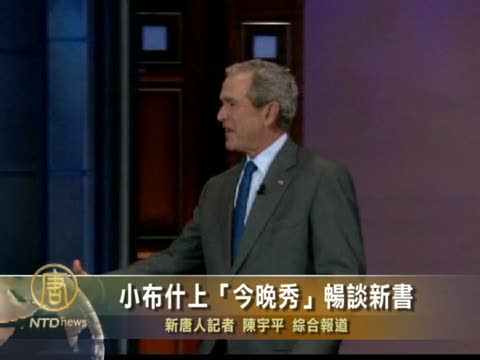 【新唐人2010年11月19日訊】美國前總統喬治•布什星期四(11月18號)現身美國NBC電視臺的談話節目“今晚秀”(The Tonight Show),與知名主持人傑•雷諾(Jay Leno)以幽默詼諧的方式暢談他任職總統期間的大小事,這些事情也都收錄在他的新書《決策點》當中。