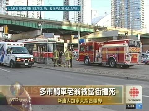 【新唐人2010年11月20日訊】今天早晨,一名60歲的老翁在靠近多倫多中區唐人街市的地方被街車裝倒,當場死亡。
