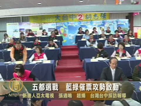 【新唐人2010年11月26日訊】五都選戰進入倒數,臺中市長胡志強與蘇嘉全陣營紛紛啟動電話催票攻勢。國民黨陣營由立法院長王金平率領13位立委進行電話催票,而蘇嘉全陣營則是請來多位現任及前任的縣長為蘇嘉全背書,向各縣市旅中同鄉電話催票。