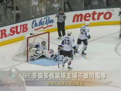 【新唐人2010年12月2日訊】昨晚,北美冰球聯賽(NHL)常規賽進行了5場的較量,多倫多楓葉隊主場3-4不敵來訪的坦帕灣閃電隊。