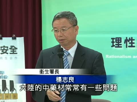 衛生署長 楊志良:「大陸的中藥材常常有一些問題,比方說重金屬,比方說殺蟲劑殘留,消基會在市面上抽檢中藥成藥,說通通不合格,採樣全部都是我們國人在大陸買的。也希望大陸方面,依據我們台灣的標準,從源頭起管制」
