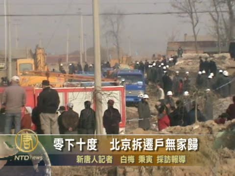 【新唐人2010年12月9日訊】北京已經是零下10度的氣候,不過一些房山區的居民,卻無家可歸。日前,他們的房子在賠償款還未談攏的情況下,被迫拆遷,共200多戶遭波及。現在,一些人只能選擇暫住在馬路邊。