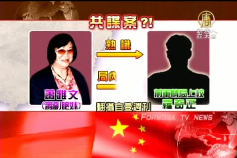 【新唐人亞太台2010年12月15日訊】鏡頭轉回台灣。11月初國防部軍情局爆發羅奇正共諜案,全案仍由檢方深入調查中,但是現在傳出羅奇正在偵訊過程,自爆與副總統蕭萬長胞妹蕭雅文熟識,還有公務往來,民進黨立委要求撤查,國防部立刻澄清表示:蕭雅文與共諜案沒有任何關係,兩人僅私人交往,無關公務。