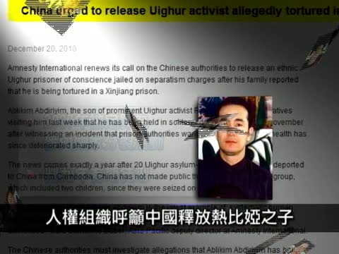 人權組織「國際特赦」敦促中國釋放流亡美國的世界維吾爾大會主席熱比婭•卡德爾的兒子阿布裏克姆。阿不都熱依木2007年被定罪為參與國家分裂活動,並被判九年有期徒刑。他上個星期在烏魯木齊對探監的親屬說,他一個月前被單獨監禁,他的健康狀況一直在惡化。