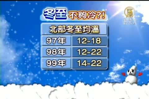【新唐人亞太台2010年12月22日訊】今天是冬至,不過您有沒有發現,溫度好像比往年冬至來得高?氣象局說,的確比前兩年高了2度左右,其實是因為這波寒流還沒報到,等到耶誕節當天溫度才會明顯下降,跟全球氣候變遷無關!另外,冬至應景吃湯圓,鹹湯圓中的茼蒿,也很應景,漲了2成。